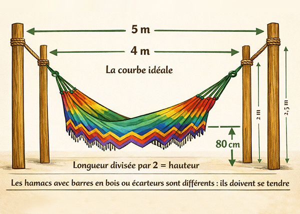 ¿Cuál es la regla a seguir para dar la curvatura correcta? Un buen ejemplo a seguir (no he inventado nada porque siempre he adquirido mis conocimientos observando a los expertos de América Latina) es el de los constructores de casas. En los estados donde el hamaca está muy presente, cuando en su plano tienen un cuarto, colocan ganchos para hamaca en las paredes antes de que estén terminadas. 4 m de longitud entre las dos fijaciones y 2 m de altura respecto al suelo. Esta es la regla: longitud dividida por 2 = altura.