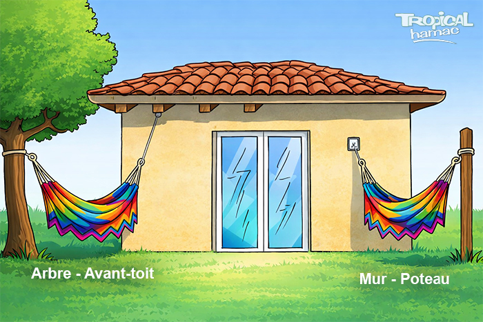 Puede elegir un solo punto de anclaje en una pared de su casa (ver croquis). Luego, en su césped, instala nuestro soporte Madera para el otro lado de la hamaca. Solución simple y eficaz, pero que no permite grandes balanceos en la hamaca. Atención con los niños.