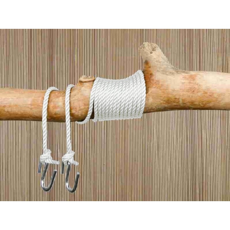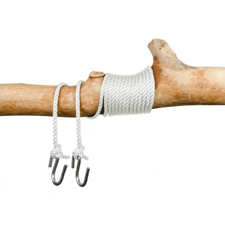 Diseñado para adaptarse a árboles, vigas o postes, este kit de fijación discreto (con 2 cuerdas blancas y 2 ganchos discretos) combina muy bien con la madera y paredes claras. Es ideal para colgar tu hamaca sin complicaciones. Un video explicativo a continuación te muestra lo fácil que es instalarlo.