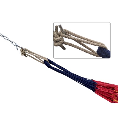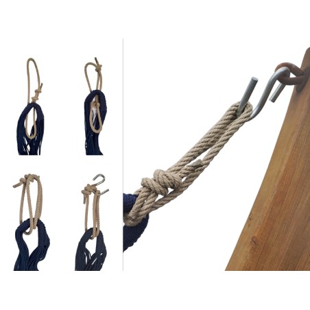 ¡No necesitas ser un experto en nudos marineros! Gracias a nuestro sistema de nudo corredizo hecho a mano en nuestro taller, la longitud se ajusta en segundos. Solo tienes que engancharlo a tu punto de fijación, pasar el otro extremo por el aro o el asa de la hamaca y luego unir todo a ese mismo punto de fijación. ¡Y listo, la hamaca está instalada... siesta a la vista!