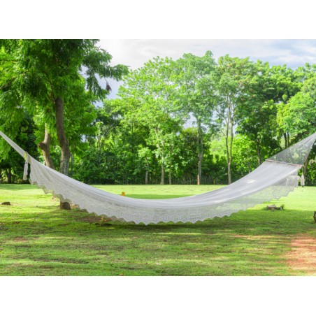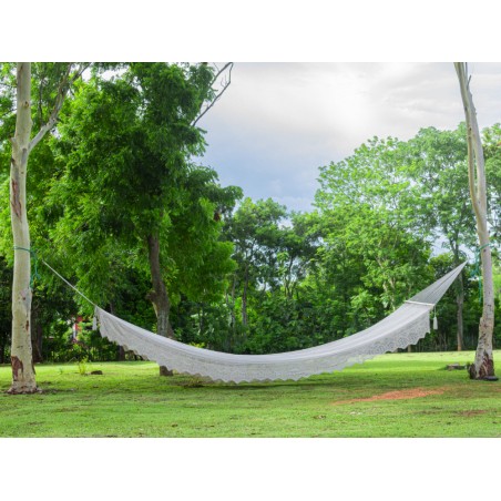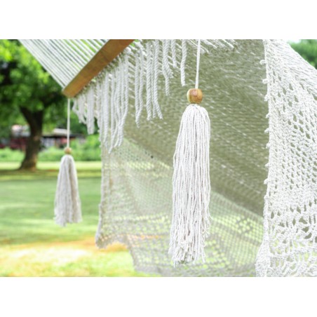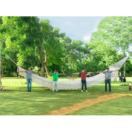 Descubra nuestro Hamaca Súper Gigante con barra, ¡la hamaca más grande del mundo, con una increíble longitud de 11 metros! Este modelo exclusivo, confeccionado por encargo, es una verdadera obra maestra artesanal. Tenga en cuenta un plazo de espera de aproximadamente un mes, el tiempo necesario para fabricarlo cuidadosamente y completamente a mano. La paciencia tiene su recompensa... ¡especialmente cuando se trata de una hamaca tan hermosa! Para los amantes de productos únicos.