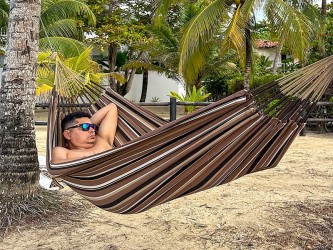 Con sus magníficas rayas en tonos chocolate, marrón y un toque de amarillo, este modelo te seducirá tanto por su estética como por su comodidad envolvente. Esta hamaca está pensada para personas de estatura media (máximo 1,70 m) que deseen tumbarse en diagonal y aprovechar al máximo la superficie disponible. Si superas esa estatura, es necesario optar por una hamaca XL o una hamaca XXL.