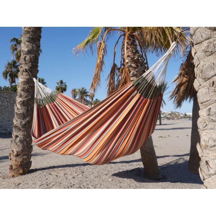 Hamaca doble Aguilas con colores vivos y energéticos. Tela de 160 x 240 en algodón reciclado. Lavable a máquina. Esta hamaca, de nuestra última colección y fabricada en nuestra fábrica hermana en Colombia, resistirá todos los juegos de tus hijos y todas las acrobacias que puedan hacer en pareja. No dudes ni un segundo de su robustez y, desde la primera vez que la pruebes, ¡déjate llevar!