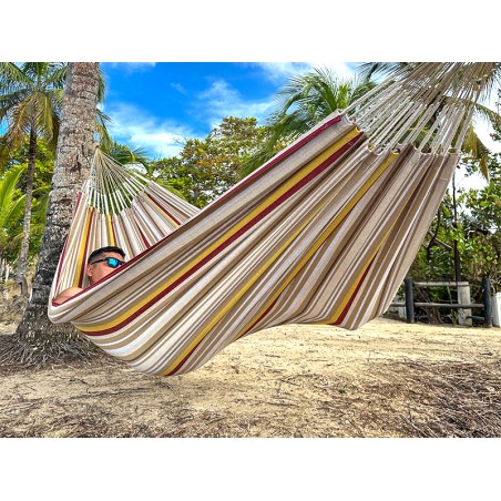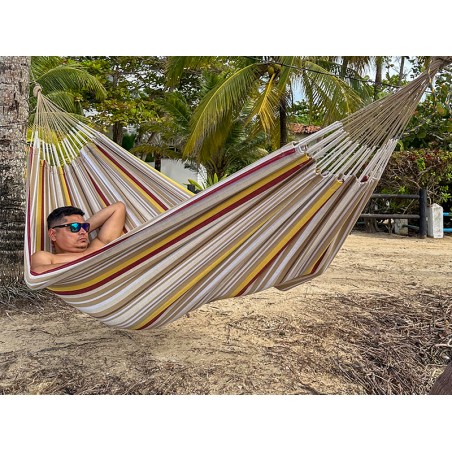 Una hamaca doble para una o dos personas, tejida por nuestra fábrica favorita en Colombia, donde la calidad está garantizada. Desde hace más de 25 años que trabajamos con este taller, le aseguramos que esta hamaca puede durarle unos diez años siempre que le dé un mínimo de mantenimiento (detalle explicado más abajo). Fabricada en algodón reciclado, este modelo es una auténtica hamaca colombiana.
