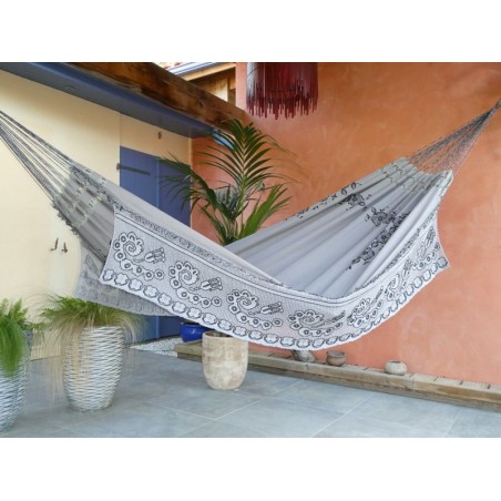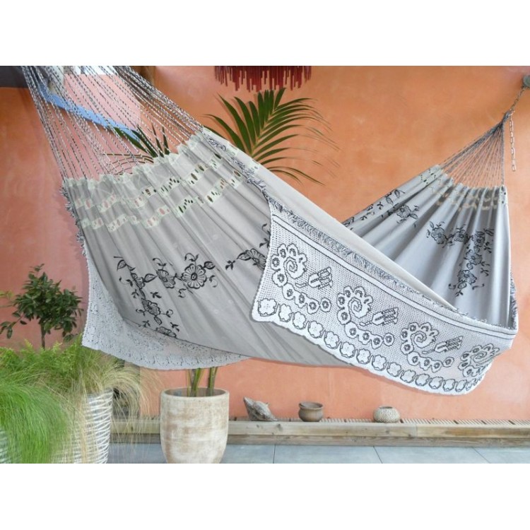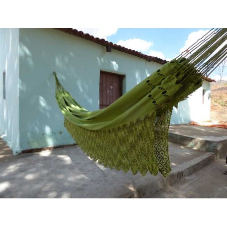 Hamaca de muy alta gama proveniente de una asociación de tejedoras del pueblo de Varzea Alegre en el estado de Ceará, Brasil. Artesanía con acabados perfectos. Flecos muy detallados y completamente hechos a crochet. Modelo blanco marfil en tela de percal 100% algodón, cuya particularidad es la frescura. Bordado en la sábana.