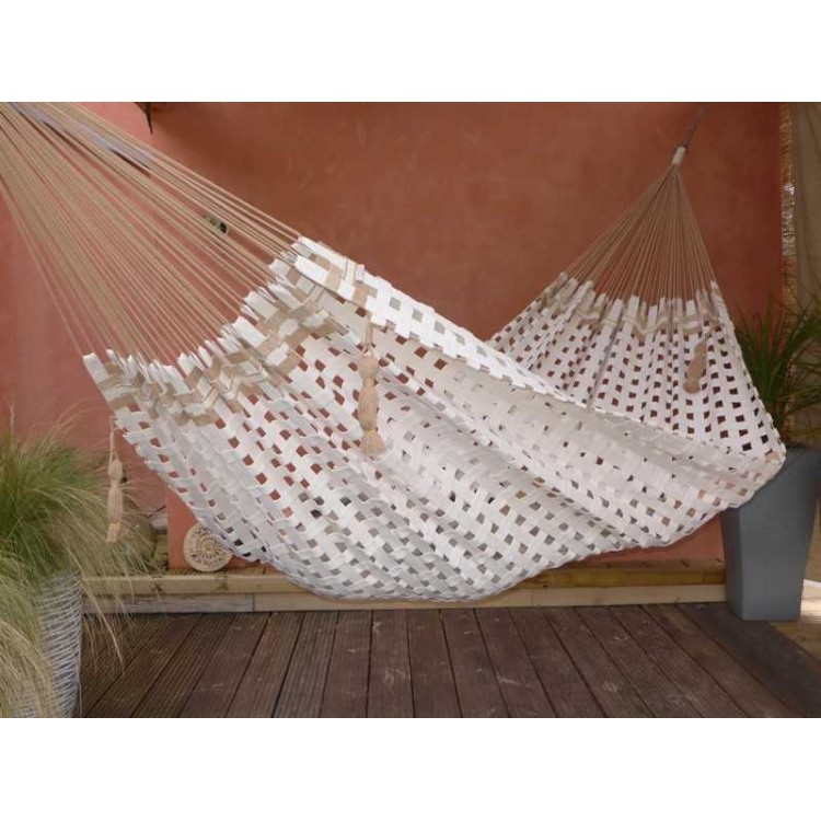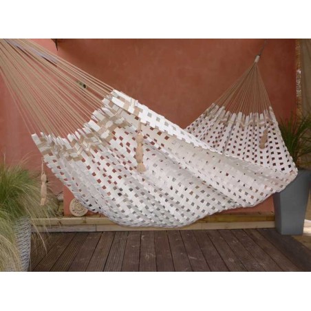 Este hamac es muy laborioso de fabricar. Hay que colocar en una enorme mesa de 250 x 200 las tiras cruzadas. Luego, hay que pegarlas una a una en sus extremos para que se mantengan juntas antes de pasarlas por una máquina de coser para ensamblarlas definitivamente. El diseño original está presente en todo este hamac y los diseñadores brasileños se han inspirado hasta en el más mínimo detalle.