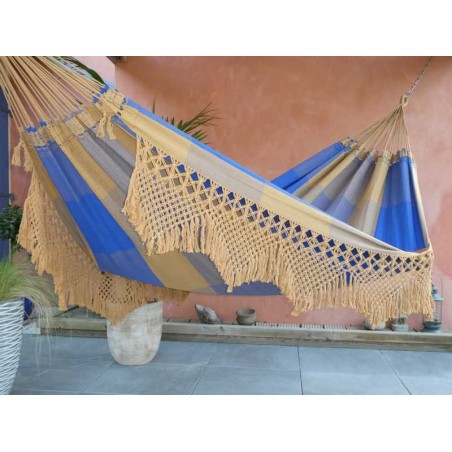 Hamaca de Brasil en algodón reciclado. Hermosa armonía en estos colores azul y caramelo. Flecos artesanales cuidadosamente elaborados. Modelo espacioso y cómodo. Lavable a máquina.