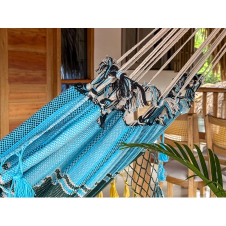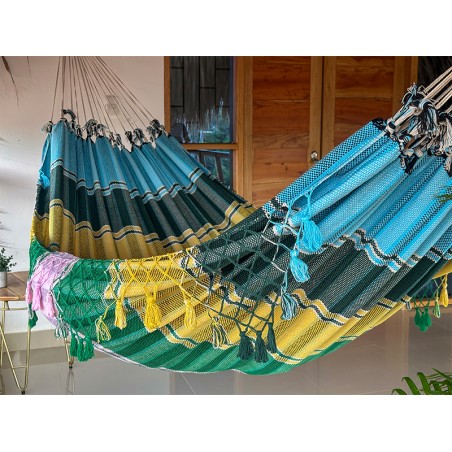 Esta hamaca venezolana no debe permanecer de forma permanente en el exterior o en su jardín. Su tela 100% algodón, muy gruesa, puede retener la humedad, dificultando el secado. Por eso, se recomienda guardarla después de cada uso para preservar su calidad. Más información en nuestra página: Uso en exterior.