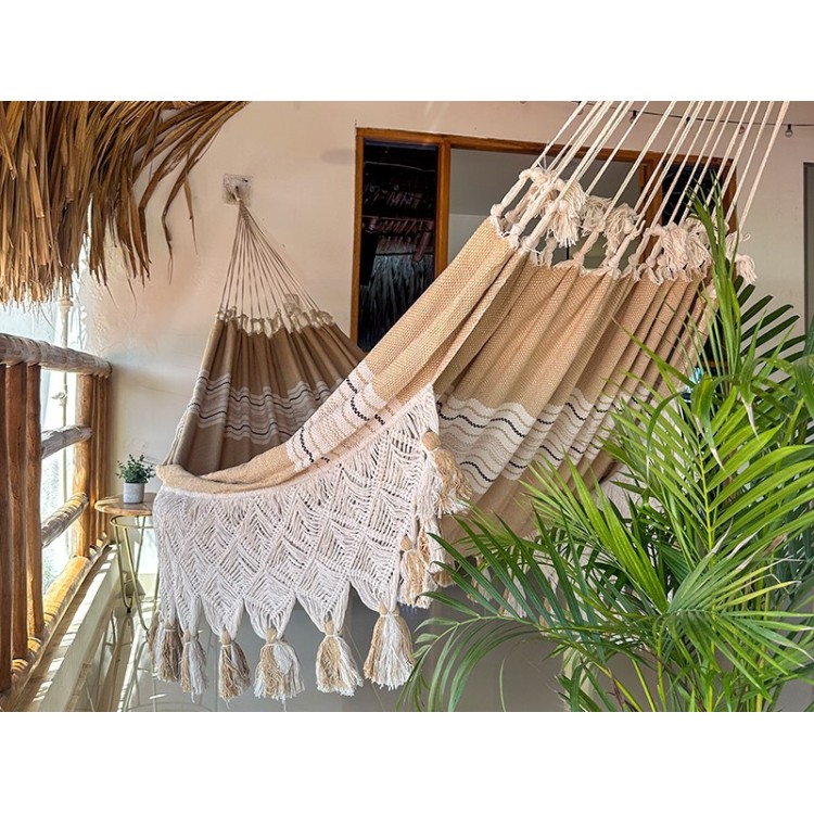 Esta hamaca es inmensa y su tela muy gruesa ofrece un confort excepcional. Su tejido ligeramente suelto proporciona una sensación única, entre las mejores que se pueden encontrar en una hamaca de tela. Los flecos, trabajados con esmero, le dan un estilo refinado y un aspecto valioso, hasta en los más mínimos detalles. Su tela extra ancha la hace tan cómoda que podrá reemplazar tu cama y te promete noches tranquilas, lejos del insomnio.