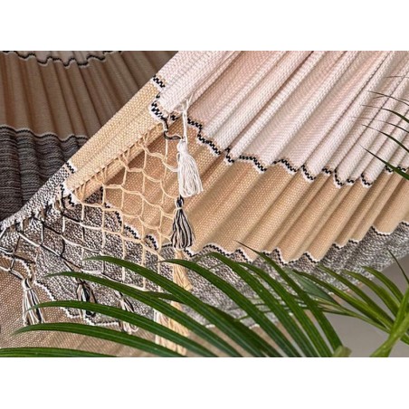 Con su lona de 2 m de ancho, su tejido artesanal y su flexibilidad incomparable, esta hamaca es una de nuestras favoritas. Se le llama con gusto la "Rolls de las hamacas". Su comodidad es tal que incluso puede reemplazar una cama para pasar la noche, especialmente si tienes dolor de espalda. ¡Un verdadero compañero de descanso, hecho para durar muchos años (incluso décadas), si le das un poco de cuidado y suavidad! Para entender por qué es bueno dormir en hamaca: Una hamaca contra el insomnio