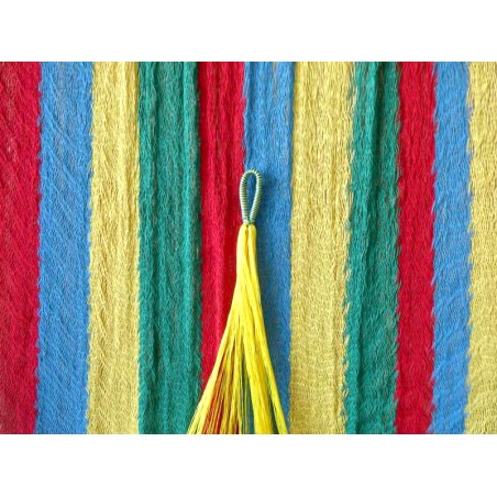 Hamaca mexicana completamente hecha a mano en Yucatán. Seleccionamos en México los modelos tradicionales y no los "hechos a la carrera" para las tiendas turísticas. El placer de los mexicanos al tejer esta hamaca es variar las combinaciones de colores. Por esta razón, cada modelo es único.Bolsa de almacenamiento incluida (Tote bag). Es muy práctica para que nunca más se enreden los brazos de la hamaca.