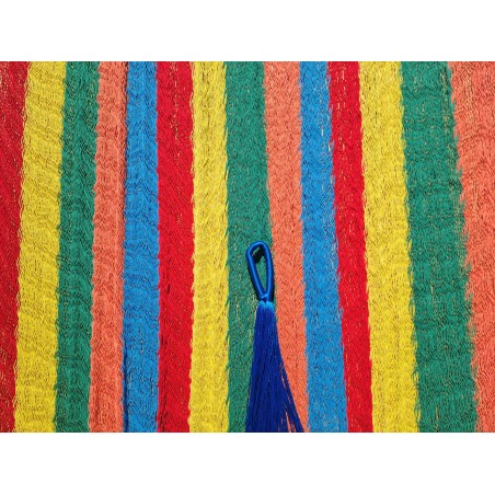 Después de pasar una semana aprendiendo a tejer esta hamaca en la isla de Holbox, en el estado de Quintana Roo en México (gracias Clara por tu paciencia y gracias a tu esposo por todos esos paseos en barco), somos capaces de repararlas. Si algún día tienes algunos hilos rotos o los brazos de la hamaca demasiado enredados, llámanos y veremos juntos qué se puede hacer. Pero atención, si 4 hilos seguidos están rotos (es decir, una malla entera), entonces la reparación ya no es posible porque reconstruir una malla entera sin hilo guía requiere al menos medio día de trabajo.