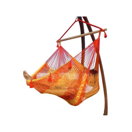 Esta hamaca silla, llegada directamente de Yucatán, está tejida a mano en 100% algodón. Su malla fina y extensible de 4 hilos, inspirada en las técnicas mayas, ofrece una comodidad excepcional: suave para la piel, casi no deja marcas, a diferencia de algunas redes.