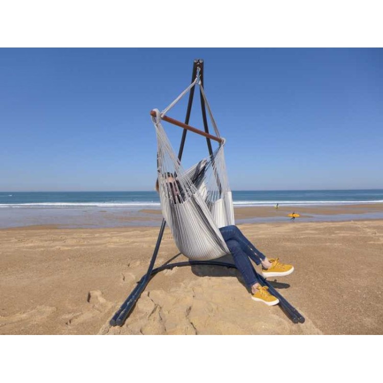 Un aspecto decididamente moderno para nuestro soporte de sillón colgante de metal Lunatta, adornado con nuestra silla Mariposita 3 Gris. Este conjunto te brindará toda la comodidad que esperas, ya que hemos mejorado aún más nuestros productos este año. La barra de madera ahora mide 125 cm de largo, lo que ofrece mayor amplitud a la altura de los codos.