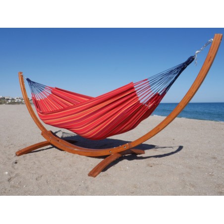 El soporte y la hamaca son exclusividades de Tropical Influences. Este soporte es uno de nuestros mejores logros. Su relación longitud / altura proporciona la curva ideal de la hamaca para un confort óptimo, ya que una hamaca debe curvarse y no tensarse. La versión occidental de la hamaca, con barras de madera o separadores en cada lado, debe tensarse, pero son muy incómodas y se vuelcan fácilmente. ¡Atención a los soportes demasiado bajos con hamacas demasiado tensas! Soporte Latino Relax en talla L con nuestra hamaca Caribe L Granada de nuestra última colección. Una creación exclusiva de Tropical hamac.