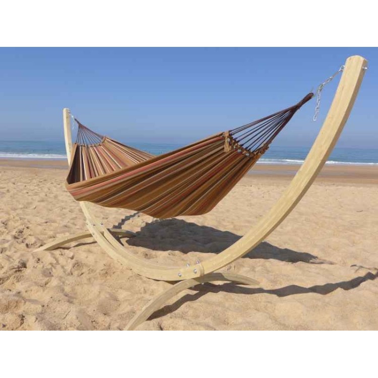 Soporte Maya Relax XL con nuestra hamaca Caribe XL "Sertao" de nuestra colección de algodón reciclado. Un soporte con una resistencia excepcional en exteriores gracias a un tratamiento en autoclave clase 4 (las patas pueden estar en contacto con la tierra).