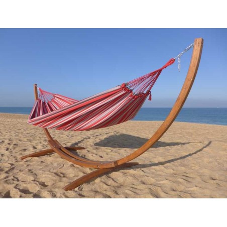 Hamaca con soporte compuesto por nuestro modelo de hamaca Osiris en color rojo dominante y soporte de madera de alerce. Creación textil por Tropical Influences. Déjese mecer... Todos nuestros artículos están en stock en nuestros propios almacenes y se envían el mismo día o al día siguiente de su pedido.