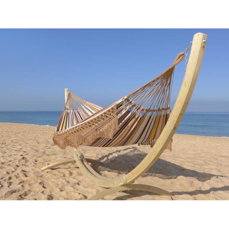 Conjunto armonioso con esta hamaca de Brasil Tambora con rayas contrastantes junto con nuestro soporte más grande (Maya King de 390 cm de largo) en madera laminada encolada de 10 capas de abeto.