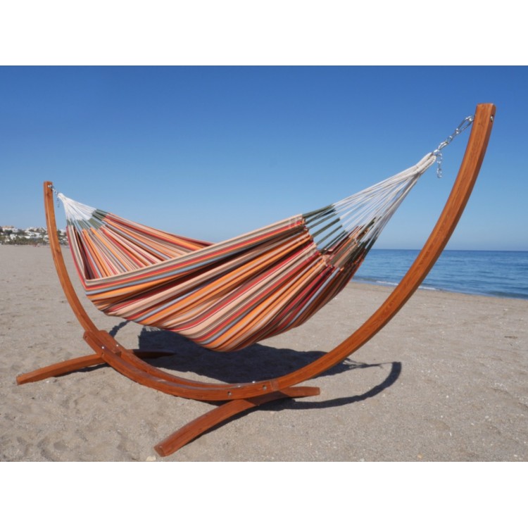 Hamaca con soporte compuesto por nuestro modelo exclusivo de hamaca Caribe Aguilas para Tropical Influences y soporte de madera de alerce. Creación textil por Alesko sobre el tema de Andalucía. Este modelo representa los colores alegres del carnaval de Águilas. Este pequeño pueblo costero acoge el segundo carnaval más grande de España. ¡Déjese llevar por la fiesta andaluza! Todos nuestros artículos están en stock en nuestros propios almacenes y se envían el mismo día o al día siguiente de su pedido.