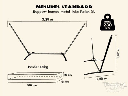 El soporte de metal Inka Relax XL es el aliado perfecto para la hamaca doble. Construido en acero gris antracita, ofrece una estabilidad excepcional gracias a sus pies curvados y a una altura estudiada de 142 cm. Con una longitud de 335 cm, se adapta a la mayoría de las hamacas de hasta 375 cm cuando están extendidas, garantizando una instalación sólida y segura.