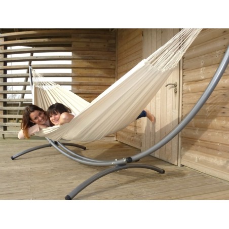 Este soporte de hamaca es un modelo exclusivo desarrollado por Tropical hamac, especialmente diseñado para ofrecer el mejor confort de las hamacas latinoamericanas. Fabricado en acero de 60 mm de diámetro, pesa por sí solo 27 kg: una verdadera garantía de solidez y estabilidad. A diferencia de otros soportes de acero más delgado (40 mm), este no sacrifica nada de robustez. Recibe fácilmente una hamaca doble, incluso con dos adultos en movimiento. Su altura de enganche está optimizada para ofrecer una cama bien curvada, según la tradición brasileña: lo ideal para acostarse en diagonal y obtener una postura flexible y relajante.