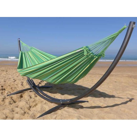 El metal es un material preferido por su diseño y la solidez de nuestros soportes. Combinado con nuestra hamaca XXL Limao, este conjunto nos invita a viajar solo con cerrar los ojos. Estético y resistente, para dos o en solitario. Una creación de Tropical-hamac.