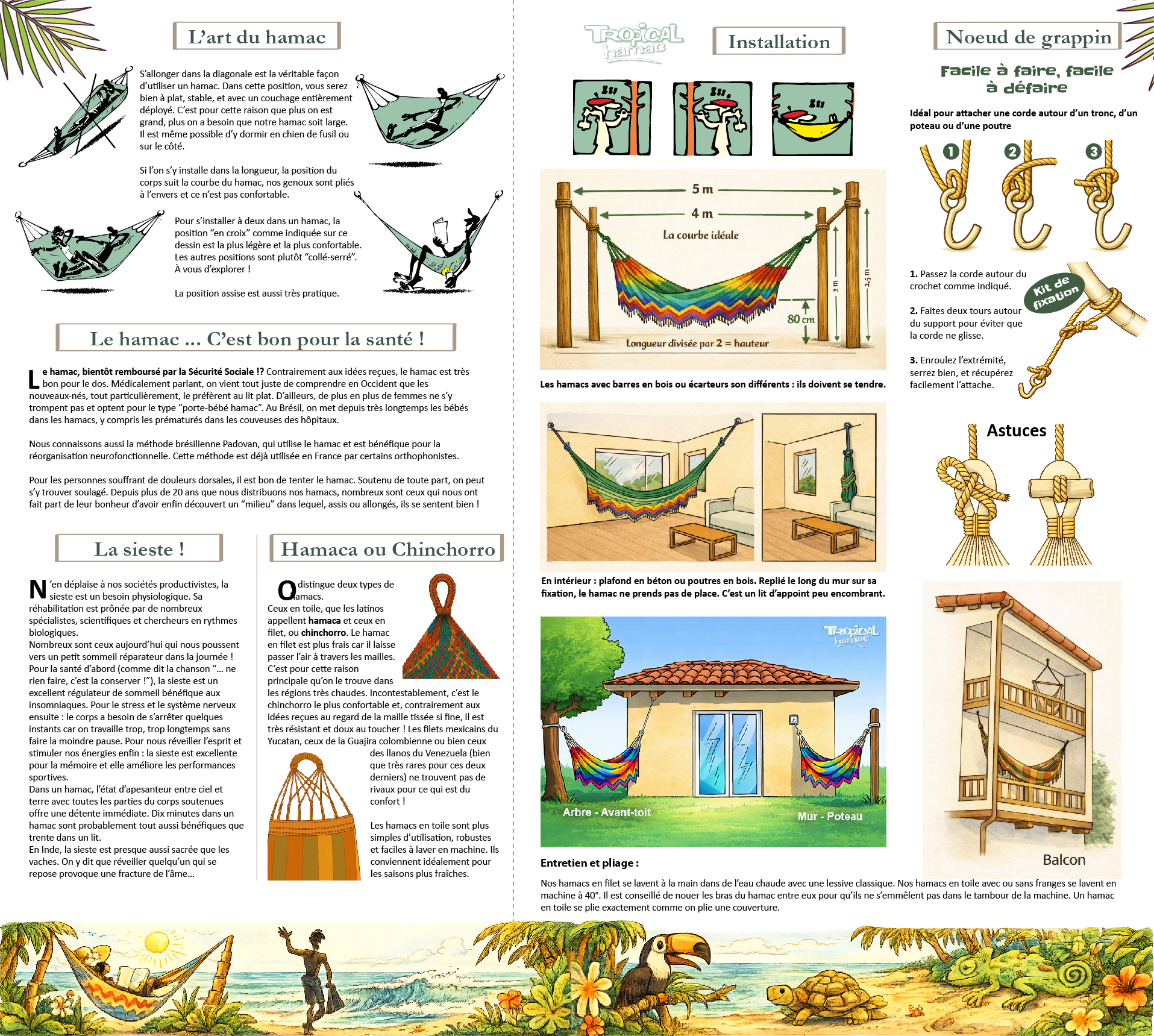 C'est tout un art. C'est même mille ans d'histoire! De trop nombreux hamacs sont vendus sans aucune notice, sans aucun conseil. Et vous pouvez complètement passer à côté de cet objet si merveilleux pour se relaxer, dormir des nuits entières, en plein air comme en intérieur. Il est important qu'il soit une réussite chez vous. Pour ce faire, allons à l'essentiel et laissez-vous guider par tous nos conseils. En cas de doute ou de question, n'hésitez pas à nous contacter par téléphone au magasin. Nous nous ferons un plaisir à vous aider dans votre choix.