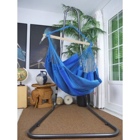 Un ensemble robuste qui a fait ses preuves depuis de nombreuses années. De par sa conception, ce support de hamac-chaise supporte un poids de 150 kg ! Il est réglable en hauteur. Le hamac-chaise Mariposita Azur XL est fabriqué en Colombie. Son fil est d'une qualité supérieure et nous sommes quasiment les seuls à conseiller un lavage en machine à 40° voir même 60° si nécessaire. Nos tests ont démontré que les couleurs commencent à souffrir à partir d'un lavage à 90° ! Tropical influences c'est avant tout un excellent rapport qualité/prix.