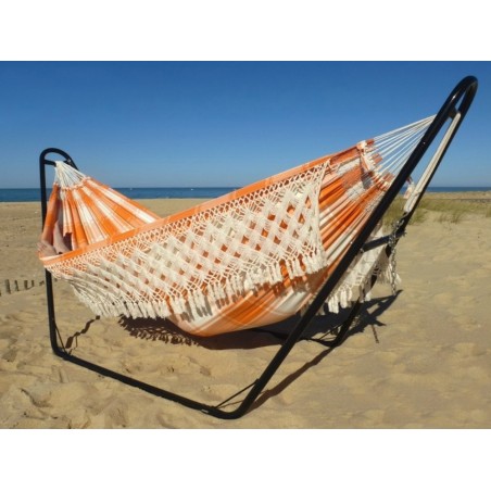 Seuls les hamacs à barres en bois ou écarteurs à chaque extrémités ne peuvent pas être utilisés sur ce support pour deux raisons : les bois vont taper sur les barres métalliques du support et la courbure du hamac est trop importante. Nous rappelons ici que pour le confort, les hamacs à barres se tendent et ceux qui n'en ont pas se courbent. Pour cette raison, le rapport longueur/hauteur de ce support est parfait pour une bonne relaxation, ou même des nuits entières dans les vrais hamacs latinos.