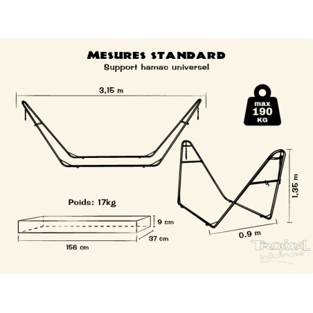 Ce support est particulièrement adapté pour les petits espaces et si vous avez le besoin d'utiliser de très grands hamacs. Totalement polyvalent grâce à son système de réglage, le support universel s'adapte à tous styles de hamacs latinos. Petite exception, le support universel ne convient pas aux hamacs à barre en bois ou écarteurs. ATTENTION: le modèle livré sera gris anthracite et non pas noir.