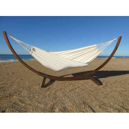 Support "LATINO RELAX L" lamellé collé de 8 plis de Mélèze naturellement imputrescible. Le hamac est en coton recyclé. L'avantage de cette matière est la douceur persistante même après de nombreux lavages en machine.