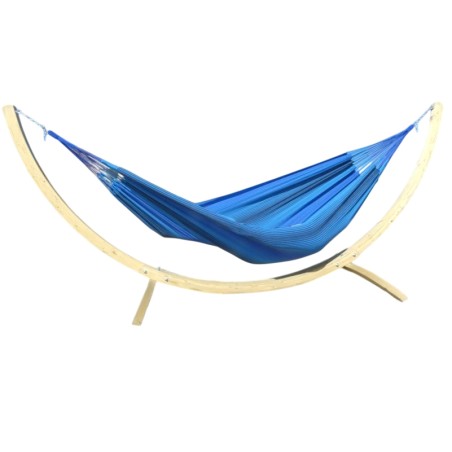 Véritable Hamac Colombien Mariposa Azur XL avec structure en bois Maya Relax XL. Les dimensions de ce support de 3m70 pour une hauteur de 1m60 procurent la courbe idéale pour le meilleur confort en hamac. Support bois d'épicéa en lamellé collé 10 plis traité autoclave pour une grande résistance aux intempéries. Hamac en coton recyclé très large pour une ou plusieurs personnes. Lavage en machine à 40°