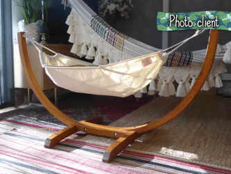 The Cayuquito is the entire support in an arc shape and its baby hammock. Here you have the true Latin American culture of the baby hammock. There is no need to invent anything else. For 1000 years in Latin America, babies have been sleeping in hammocks with this type of wooden rods to open the hammock. Easily removable, this design makes machine washing easier for you. A baby makes a lot of mess! This set will be used until the child is about 2 to 3 years old (a baby grows very fast!). The support is made of larch wood (rot-resistant); it is designed for outdoor use but also for indoor use thanks to its compact size.