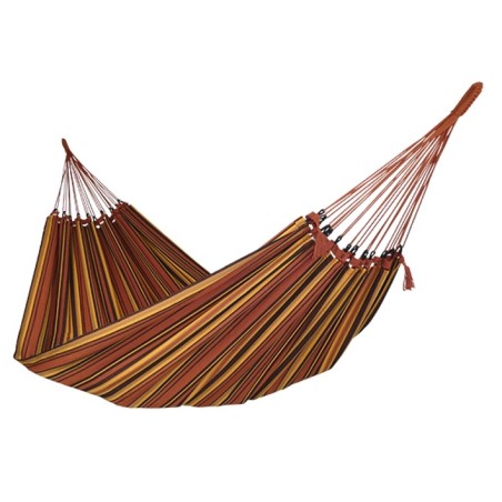 "Crépuscule" by Alesko. A model that perfectly meets our authenticity needs with its Terracotta shades but also for its comfort. A true Brazilian hammock in XL canvas, a good size for an adult 1.70m and taller and for use by two people. Crépuscule is an elegant blend of terracotta, caramel, yellow ochre, with a touch of black thread to give presence to all these colors.