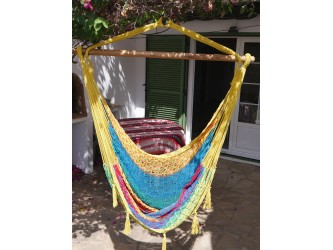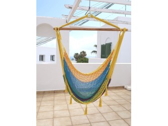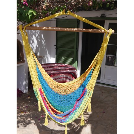 Handmade hammock chair from the houses of Yucatan in Mexico. Many possible positions in this huge and stretchable chair. 4-thread mesh invented by the Mayans (very tight and stretchable) that leaves very little marks on the skin. Ultra-resistant, and whose mesh will remain closed as originally even in 10 years. Unique model.