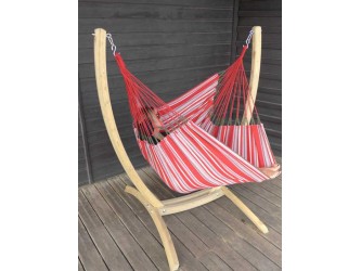 Combination of our laminated glued spruce chair-hammock stand treated to the core "class 4" and our Caribena Osiris chair-hammock in XXL size! This stand is compact and will find its place almost anywhere in the house. The bases on the floor are beveled and relatively soft for all types of flooring.