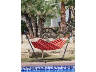 Our Inka Relax support is specially designed to provide all the comfort of Latin American hammocks without wooden bars. They need to be curved to be comfortable diagonally. The double bolting of the tubes prevents them from clashing against each other. The hammock is made in Colombia by a high-end manufacturer with whom we have been working since 1993! Machine washable up to 60° if necessary. This set is extremely durable as it passed our test with 478 kg! See the photo. Colombian hammock size L with a width of 140 cm. Creation Tropical hammock.