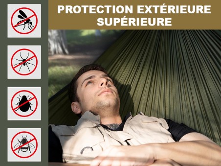 With its generous dimensions of 290 x 140 cm, this Long version is suitable for users measuring 1.80 m and above. It offers a more comfortable position than the 250 cm long models. The zippered mosquito net allows for easy opening to quickly protect yourself. The fine mesh of the mosquito net (less than 1 mm) ensures effective protection against insects, even the smallest ones.