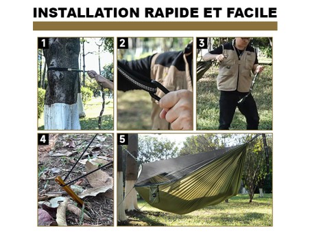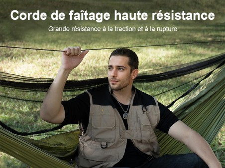 The hammock comes with two ultra-strong 3-meter straps and two sturdy aluminum carabiners, allowing for various suspension configurations. The adjustable buckle system facilitates adjustment and ensures quick installation, adapted to your needs.