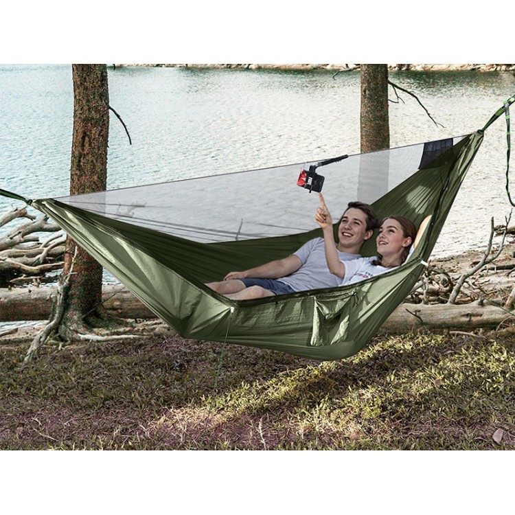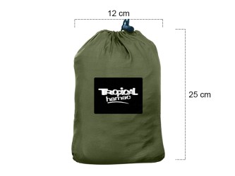 Army Green Hammock with Integrated Mosquito Net (290x140cm) – ready to use, delivered with straps and fastenings. Made from 70D nylon parachute fabric, the thickest and most durable fabric in our range, it withstands intensive use and resists the most demanding conditions. Perfect for explorers, bushcraft enthusiasts, and all adventurers seeking reliability. Color: Army Green.