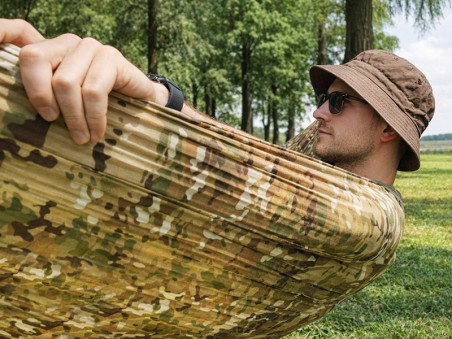 Hamac tattico ultra-leggero (360 g), pensato per le pratiche minimaliste e impegnate. Senza zanzariera né protezione dalla pioggia, va all'essenziale: robustezza, compattezza e discrezione. Perfetto per escursionismo, bushcraft e campeggio all'aperto, quando si vuole viaggiare leggeri e fondersi con la natura. Cinghie e moschettoni inclusi.