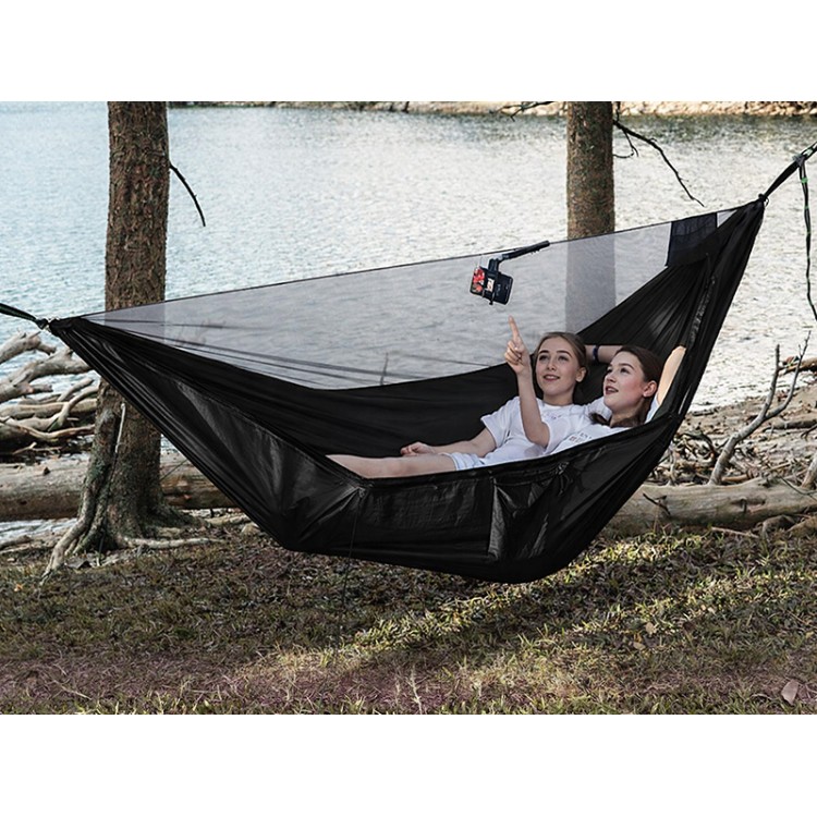 Amaca Nera con Zanzariera Integrata (290x140cm) – pronta all’uso, fornita con cinghie e fissaggi. Realizzata in tessuto nylon parachute 70D, il tessuto più spesso e resistente della nostra gamma, supporta un uso intensivo e resiste alle condizioni più esigenti. Perfetta per i viaggiatori avventurosi, gli appassionati di bushcraft e tutti gli avventurieri in cerca di affidabilità. Colore: Nero.