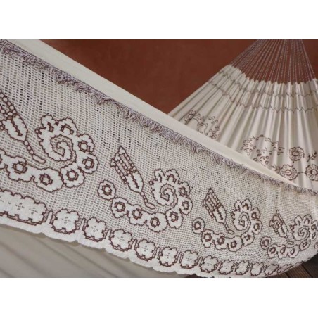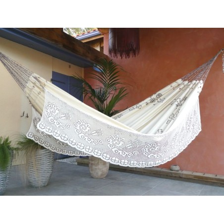 Amaca di altissima qualità proveniente da un'associazione di tessitrici del villaggio di Varzea Alegre, nello stato di Ceará in Brasile. Artigianato con finiture perfette. Frange molto dettagliate e interamente realizzate all'uncinetto. Modello bianco avorio in tela di percalle 100% cotone, la cui particolarità è la freschezza. Ricamo sul telo.