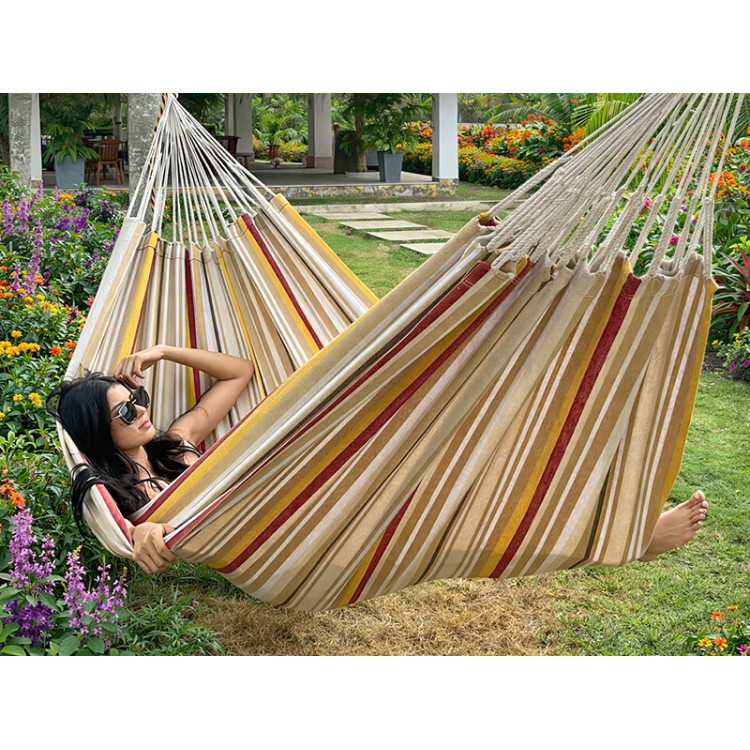 Novità 2025! Un design esclusivo firmato Elisa, la nostra designer con base in Nicaragua. Un'amaca unica che non troverai da nessun'altra parte. Modello taglia L per una persona, tessuto in Colombia con cotone riciclato. Le sue righe (giallo sole, bordeaux intenso e beige sabbia) portano luce e calore, evocando al tempo stesso l’energia della Colombia. Un mix di vitalità ed eleganza naturale.