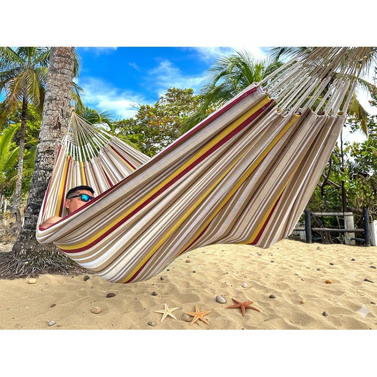 Amaca sudamericano tessuto a Barranquilla (Colombia). Tessuto molto resistente in cotone riciclato. Design esclusivo firmato Elisa, la nostra designer residente in Nicaragua. Un’amaca XL a righe calde, nei toni dorati, bordeaux e sabbia. Un telo per amaca etico e artigianale che offre uno spazio per sdraiarsi di 160 cm su una lunghezza totale di 360 cm (con le corde). Adatta a una persona alta più di 1,70 m fino a 1,85 m per sdraiarsi in diagonale.