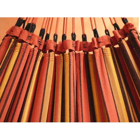 Modello familiare fabbricato in Brasile con cotone riciclato. I colori resistono sia al sole che al lavaggio in lavatrice. Un'amaca di dimensioni XXL per i più alti ma anche per chi ama usarla in due! Modello Crepuscolo, creazione Tropical Influences.