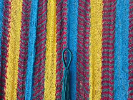 Dopo aver passato una settimana a imparare a tessere questa amaca sull’isola di Holbox, nello stato di Quintana Roo in Messico (grazie Maria per la tua pazienza e grazie a tuo marito per le numerose gite in barca), sono in grado di ripararle. Se un giorno avete qualche filo rotto o le braccia dell’amaca troppo intrecciate, chiamatemi in negozio e vedremo insieme cosa si può fare. Ma attenzione, se 4 fili vicini sono rotti (cioè un’intera maglia), la riparazione non è più possibile perché ricostruire un’intera maglia senza filo conduttore richiede almeno mezza giornata!