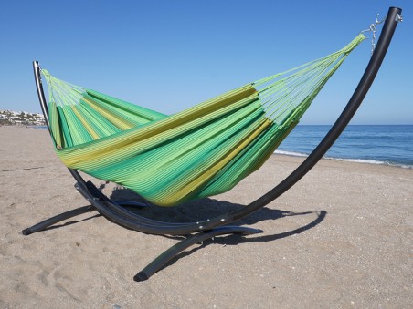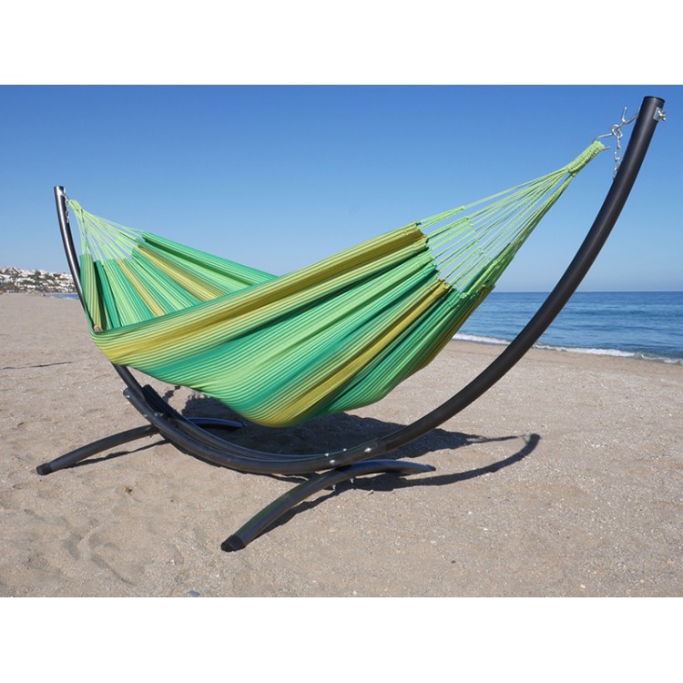 Il set supporto Azteka Relax XL con amaca MARIPOSA XL Sole verde unisce il meglio del comfort e dell’artigianato colombiano. Il supporto in acciaio da 60 mm, progettato esclusivamente per Tropical Hamac, offre una stabilità eccezionale e una curvatura ideale per godersi appieno l’amaca latinoamericana. L’amaca doppia, realizzata artigianalmente in Colombia in cotone riciclato Ecotec, è spaziosa, resistente e incredibilmente morbida, con il suo design giallo e verde che dona un tocco tropicale a qualsiasi ambiente. Insieme, formano un’installazione solida, estetica e durevole, perfetta per rilassarsi in due in giardino, sulla terrazza o in casa, senza bisogno di alberi né punti di ancoraggio.